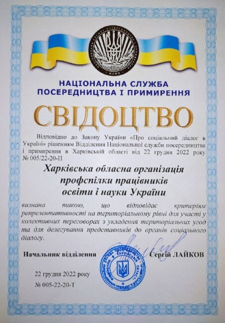 Начальник відділення Національної служби посередництва і примирення в Харківській області Сергій Лайков вручив Голові Харківської обласної організації профспілки працівників освіти і науки України Лідії Дулуб Свідоцтво про визнання Харківської обласної організації профспілки працівників освіти і науки України такою, що відповідає критеріям репрезентативності на територіальному рівні для участі у колективних переговорах з укладання територіальних угод та для делегування представників до органів соціального діалогу.
