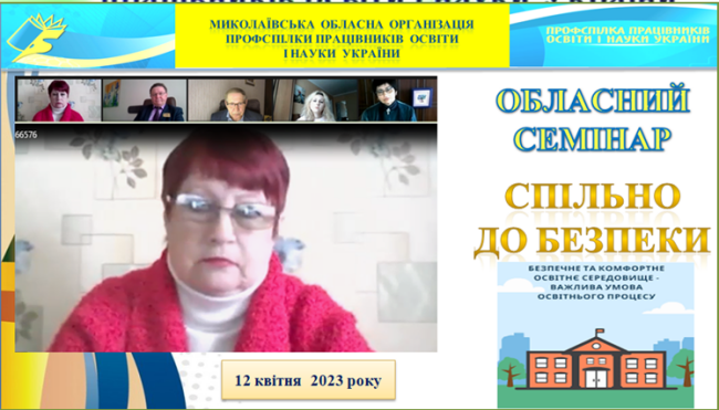 Учасникам семінару було продемонстровано відеорепортажі з інтерв’ю керівників закладів освіти м. Миколаєва стосовно облаштування приміщень для укриття учасників освітнього процесу, самі укриття, кабінети з охорони праці.