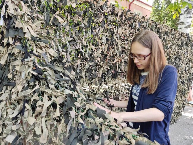 Нещодавно з’явився запит від військових на виготовлення надшоломників. І знову ми не залишились осторонь. Одні виплітають основи для їх виготовлення, інші вив’язують стрічками.