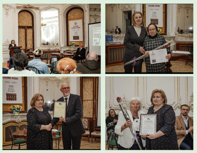 За багаторічну плідну науково-просвітницьку й творчу діяльність та з нагоди 100-річчя з дня заснування культурного науково-просвітницького центру «Будинок вчених» почесними грамотами ЦК Профспілки працівників освіти і науки України та комітету обласної організації були нагороджені: