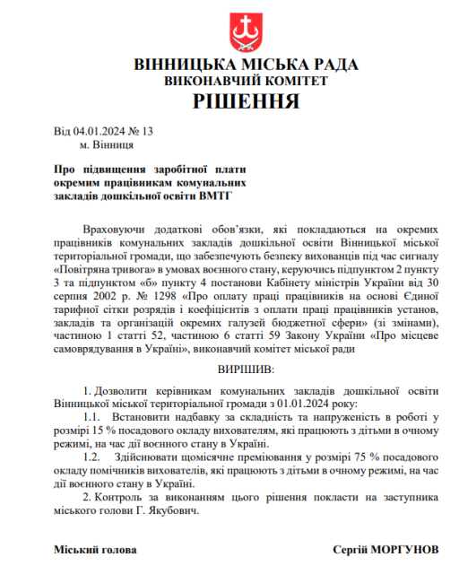 «Дозволити керівникам комунальних закладів дошкільної освіти Вінницької міської територіальної громади з 1.01.2024 року:
