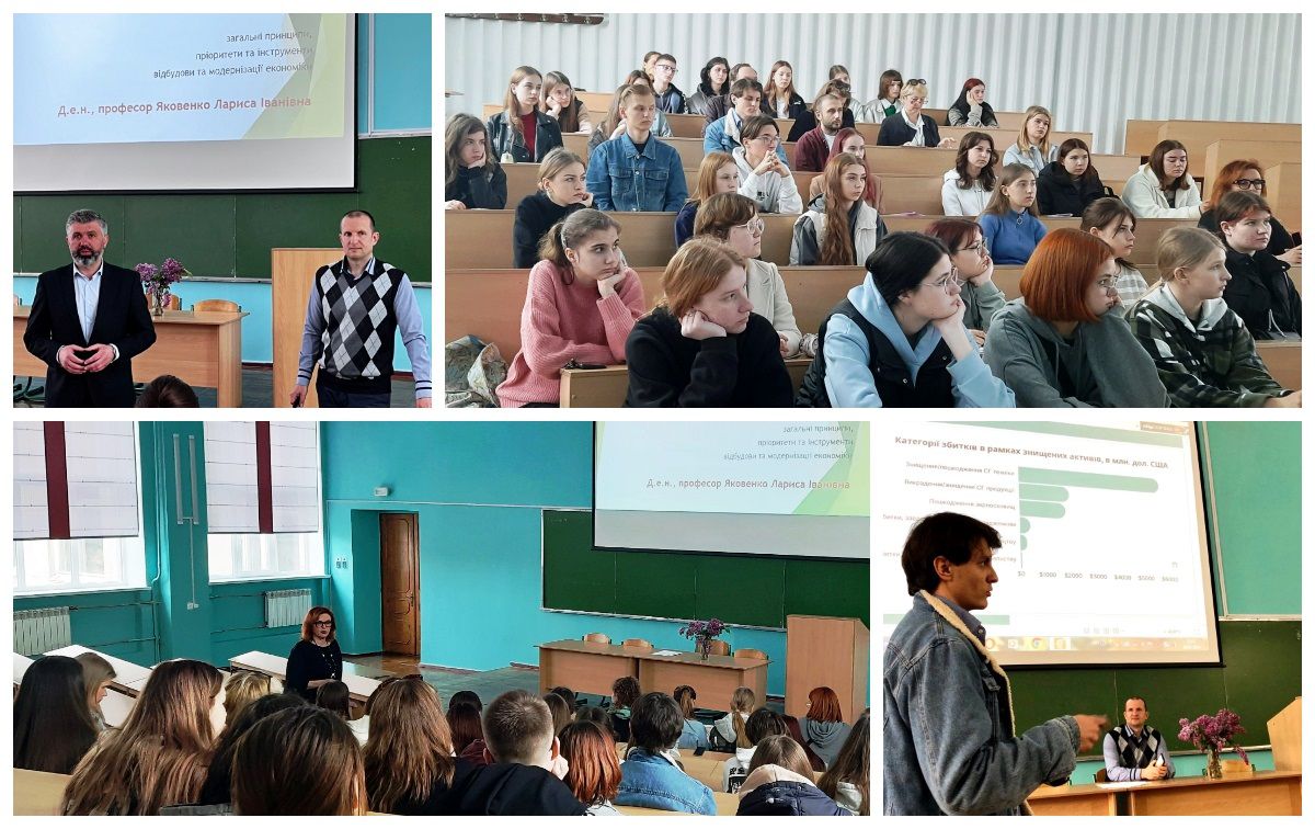Із засадничими принципами організації промислової політики України в умовах війни та повоєнного відновлення ознайомила присутніх професорка кафедри політекономії Лариса Яковенко, яка наголосила на необхідності глибинної трансформації національної економіки, зміни її структури, відмови від сировинної орієнтації економічної системи та формування потужного військово-промислового комплексу.