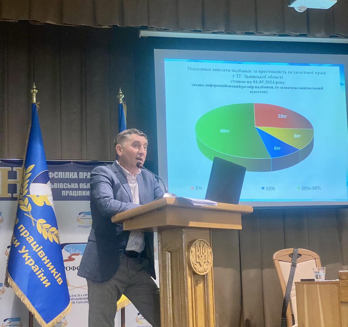 Мар’ян Калин звернув увагу на важливість укладення Угод між територіальними організаціями профспілки працівників освіти і науки України та органами управління освітою територіальних громад. Зазначив, що представники профспілки беруть у переважній більшості активну участь у роботі атестаційних та конкурсних комісій територіальних громад, у процесах трансформації мережі закладів освіти Львівської області.