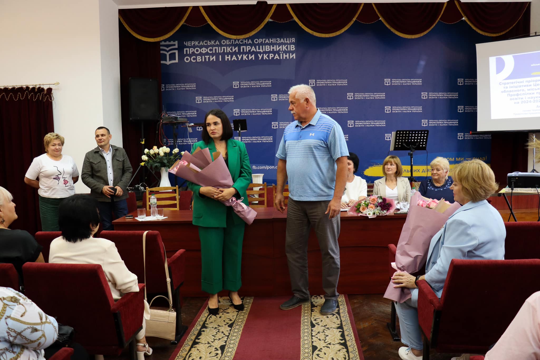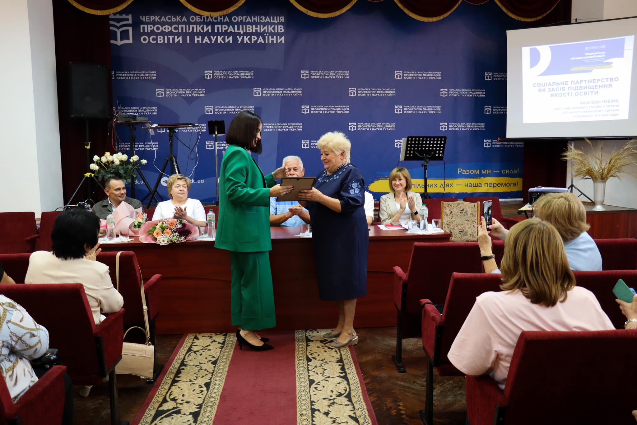 Від імені Черкаського міського голови Анатолія Бондаренка, заступниця Анастасія Чубіна вручила Подяку Ганні Федорченко, голові Черкаської міської організації Профспілки працівників освіти і науки України.