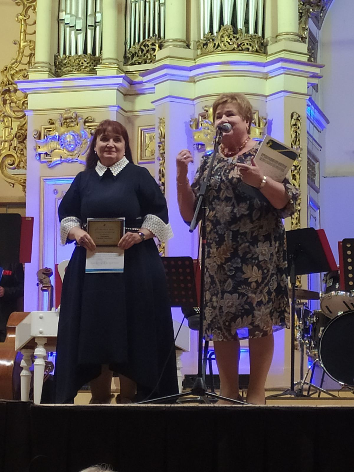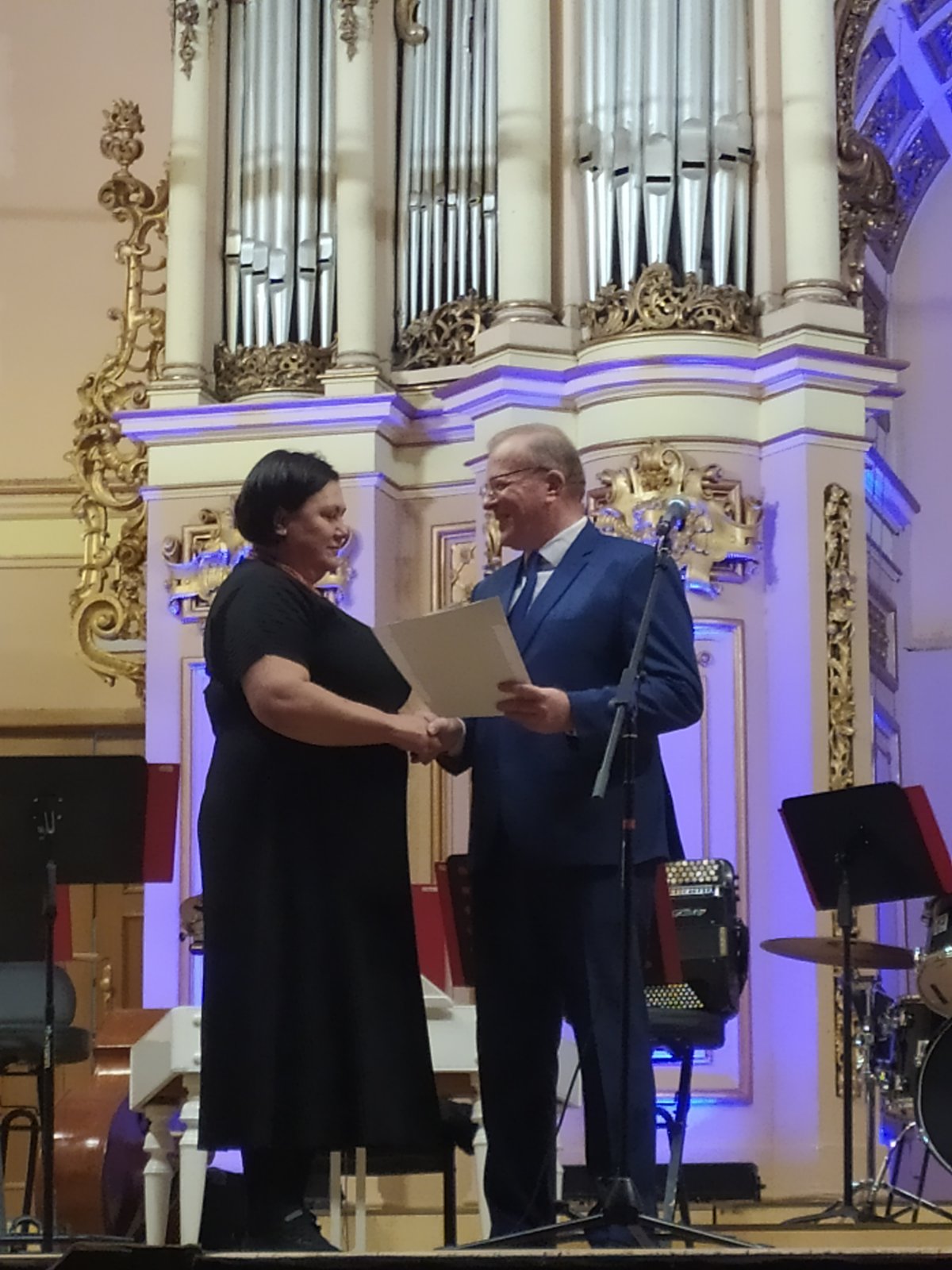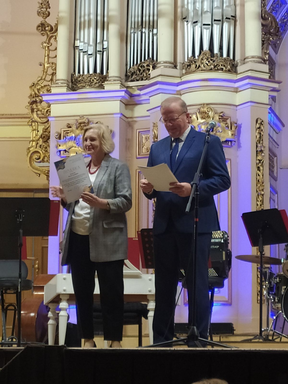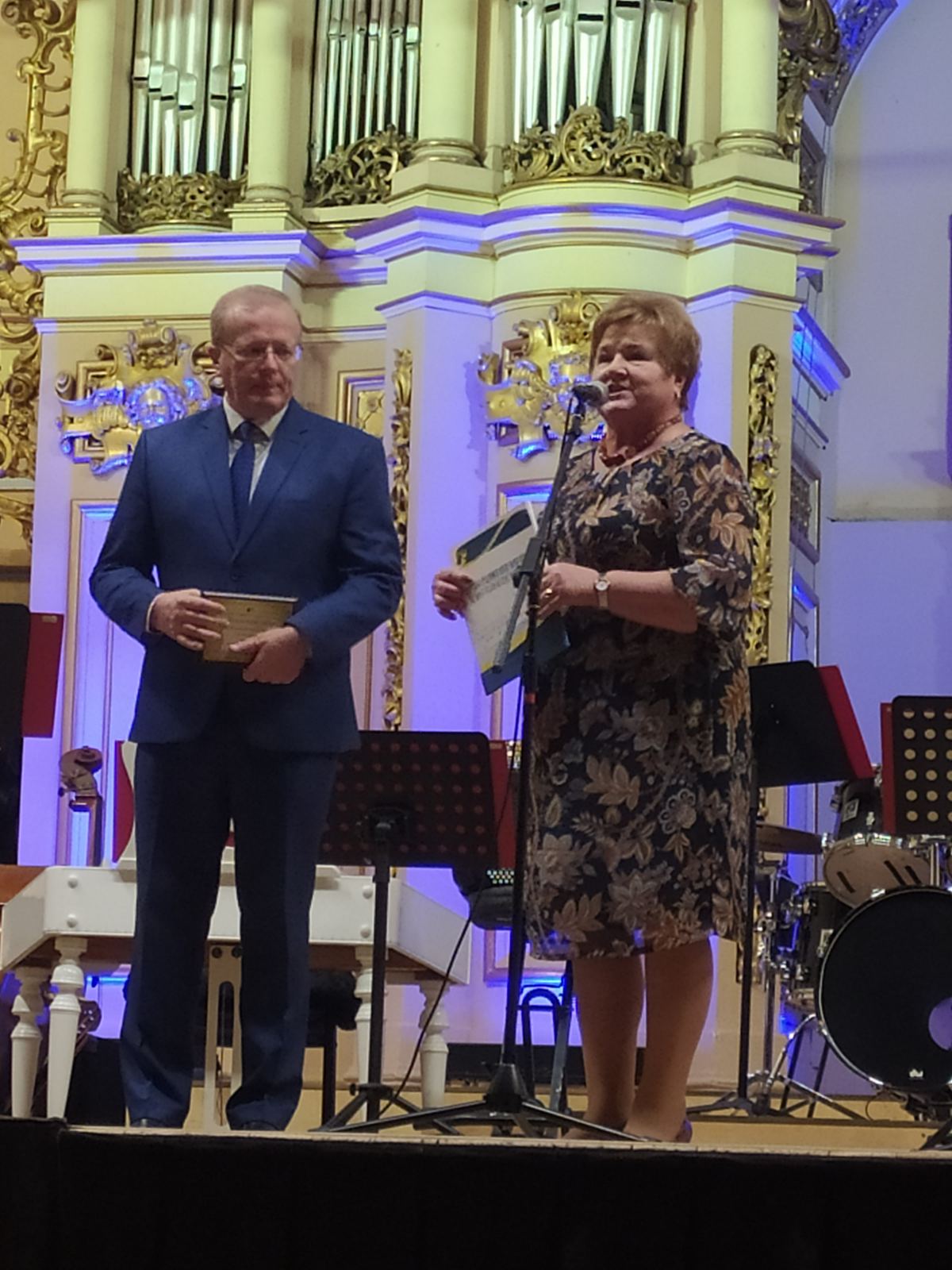 Ведучий святкового дійства Роман Павлович Береза запрошує на сцену Марію Григорівну Яцейко – голову Львівської обласної організації профспілки працівників освіти і науки України, яку присутні у залі зустрічають оплесками.