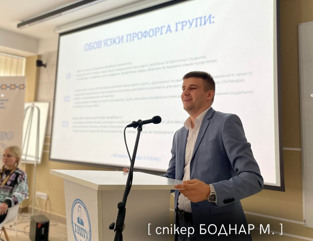 Керівник профспілкової організації студентів Михайло Боднар ознайомив присутніх із основними положеннями Статуту галузевої Профспілки, детальніше зупинившись на повноваженнях студентського профспілкового комітету, а також дав рекомендації ефективної командної взаємодії.