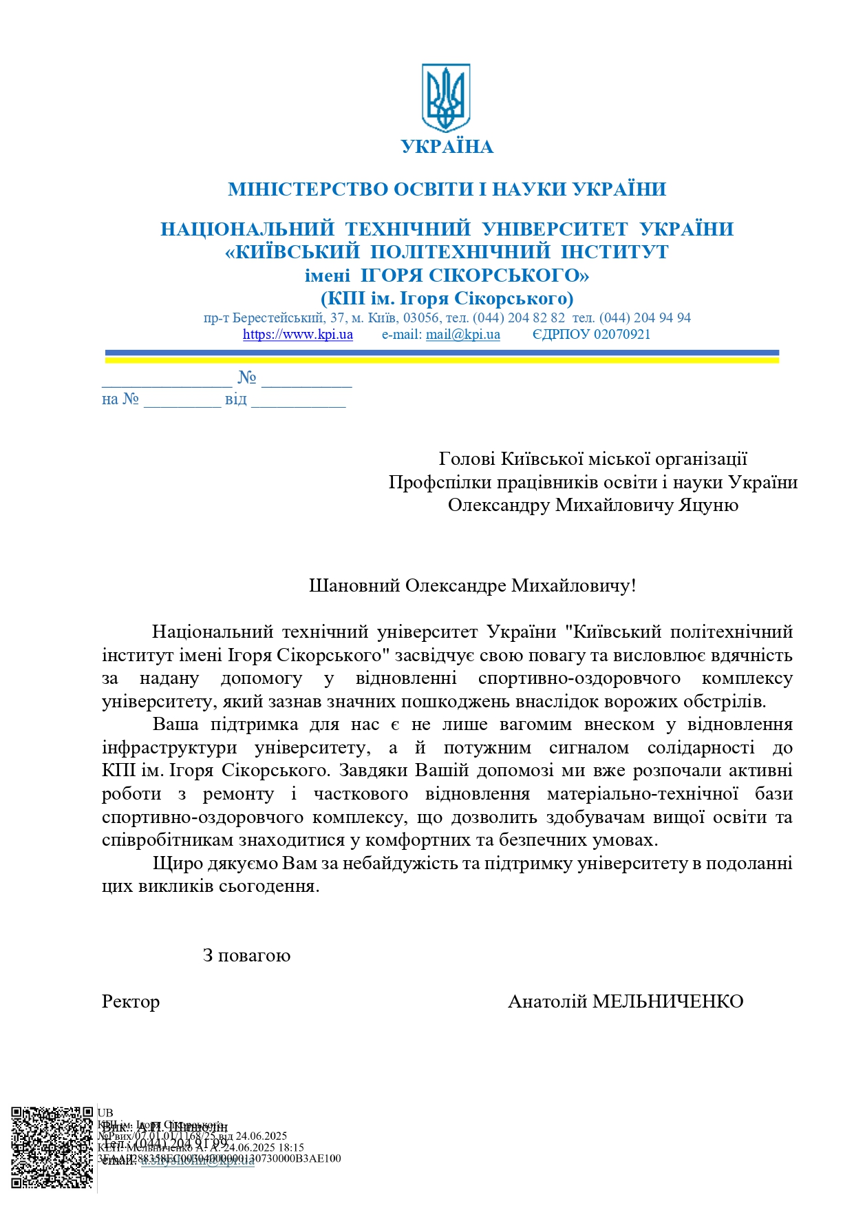 Національний технічний університет України «Київський політехнічний інститут імені Ігоря Сікорського» висловив вдячність Київській міській організації Профспілки працівників освіти і науки України за надану допомогу у відновленні спортивно-оздоровчого комплексу університету, який зазнав значних пошкоджень внаслідок ворожих обстрілів.