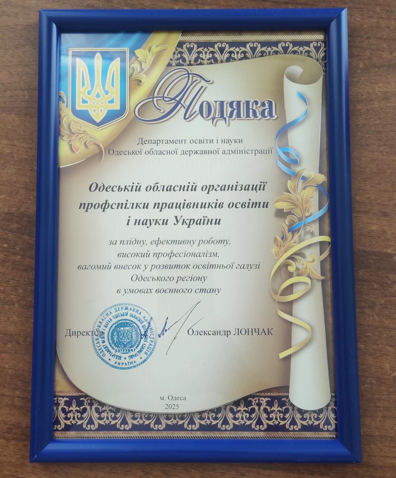 За плідну та ефективну діяльність, високий професіоналізм і вагомий внесок у розвиток освітньої галузі в умовах воєнного стану Одеська обласна організація Профспілки була відзначена Подякою Департаменту освіти і науки Одеської ОДА.