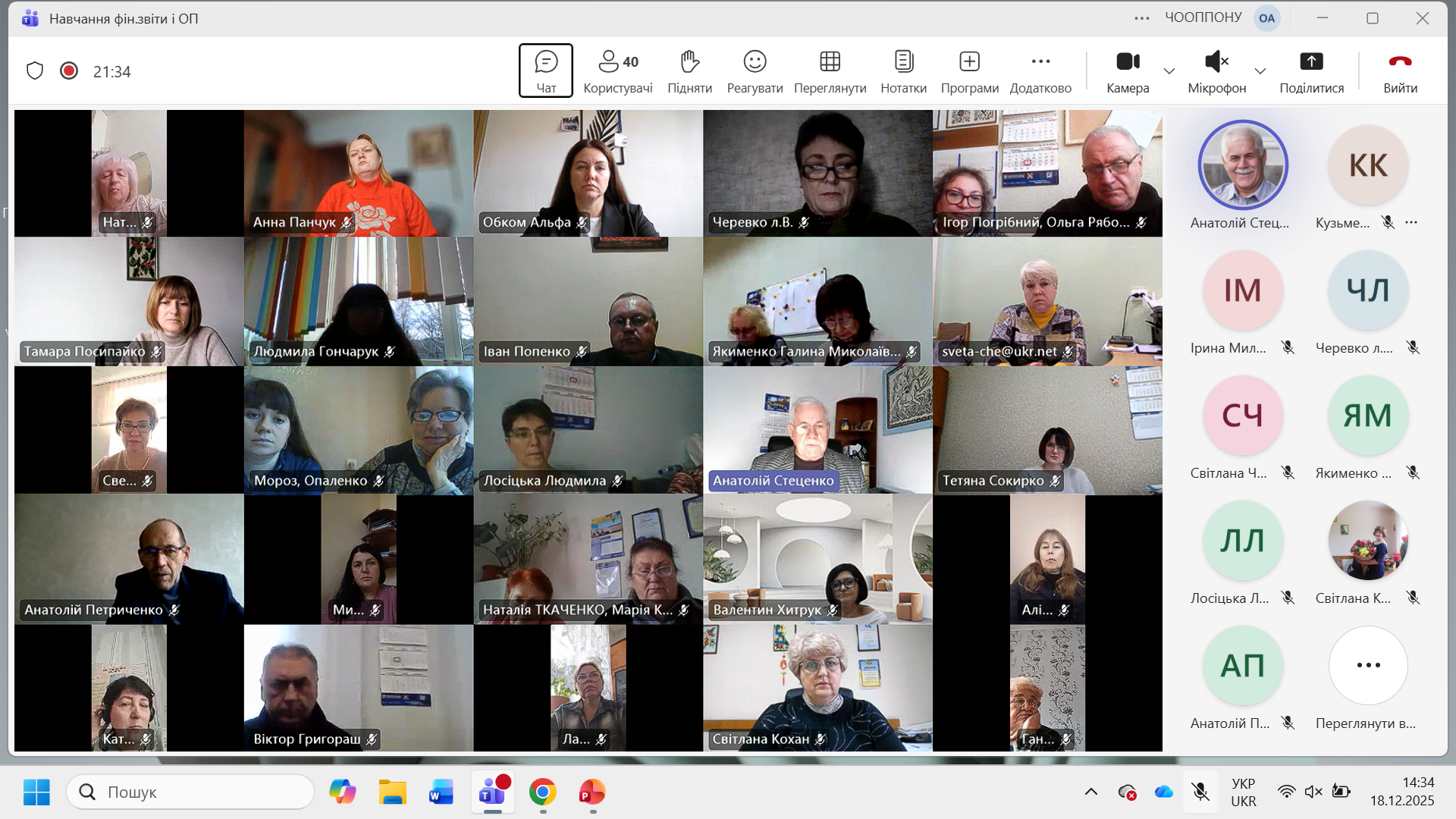 18 грудня 2025 року офіс Черкаської обласної організації Профспілки працівників освіти і науки України провів на платформі Microsoft Teams онлайн-навчання голів і бухгалтерів міських, районних, об’єднаних організацій Профспілки, первинних профспілкових організацій закладів вищої, передвищої, професійної (професійно-технічної) освіти з тем: «Фінансова звітність: ключові принципи та практичні поради» та «Розділ «Охорона праці» у колективному договорі».