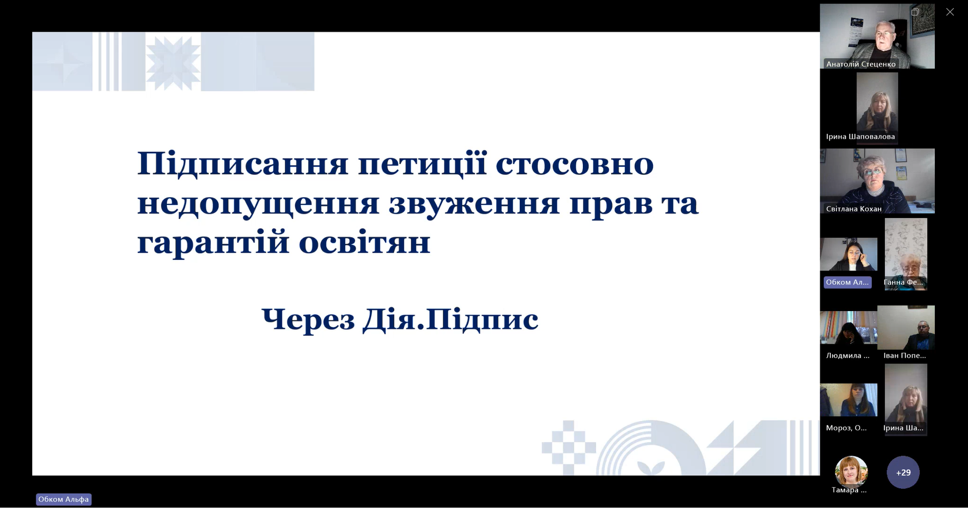 Потім Анна Куленко, завідувач відділу загального та інформаційного забезпечення обкому Профспілки, провела наочний інструктаж з підписання петиції стосовно недопущення звуження прав освітян, оскільки в багатьох спілчан виникали складнощі з цього питання.