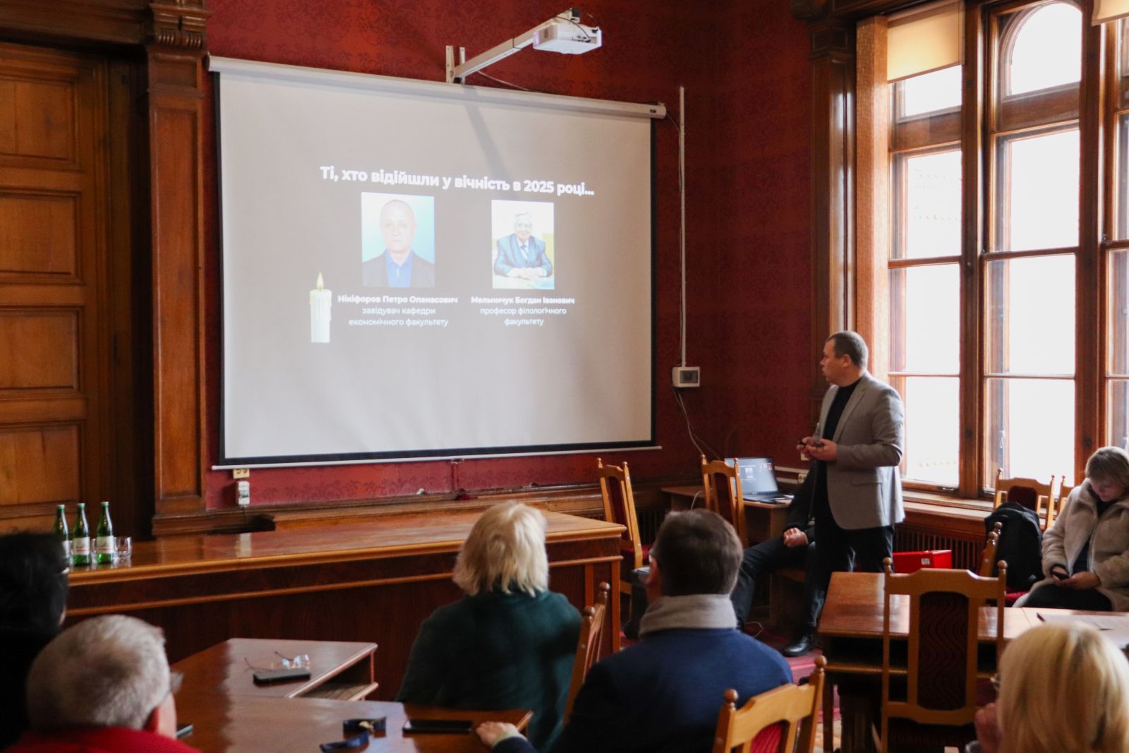 Перед початком роботи учасники вшанували хвилиною мовчання пам'ять захисників України, які загинули у боротьбі за незалежність, та співробітників університету, які пішли з життя у 2025 році.