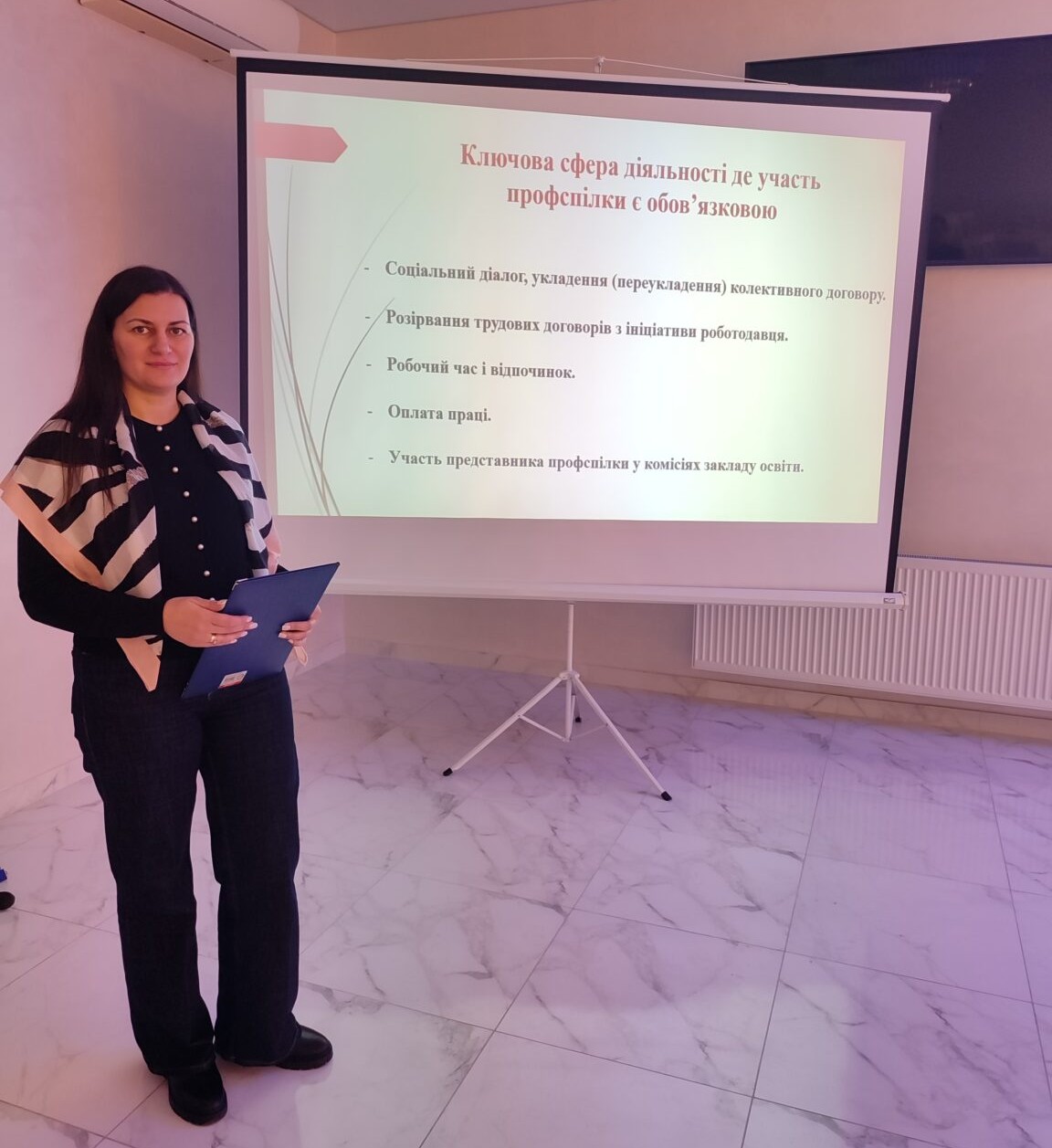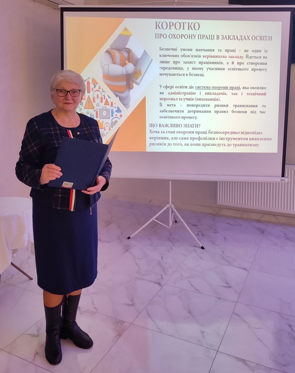 Світлана Сег, відповідальний представник з охорони праці обласної організації Профспілки озвучила важливе питання щодо організації роботи з охорони праці. Була розглянута нормативно-правова документація з охорони праці, повноваження профспілок з питань охорони праці, розділ «Охорона праці» в колективному договорі та основні дії профспілок у розслідуванні нещасних випадків.