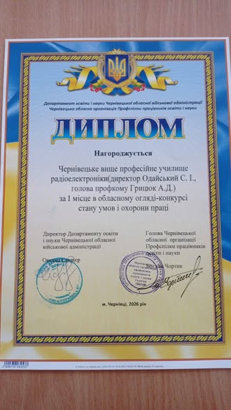 Чернівецьке вище професійне училище радіоелектроніки здобуло І місце в обласному огляді-конкурсі стану умов і охорони праці, підтвердивши високі стандарти безпеки та організації освітнього процесу.