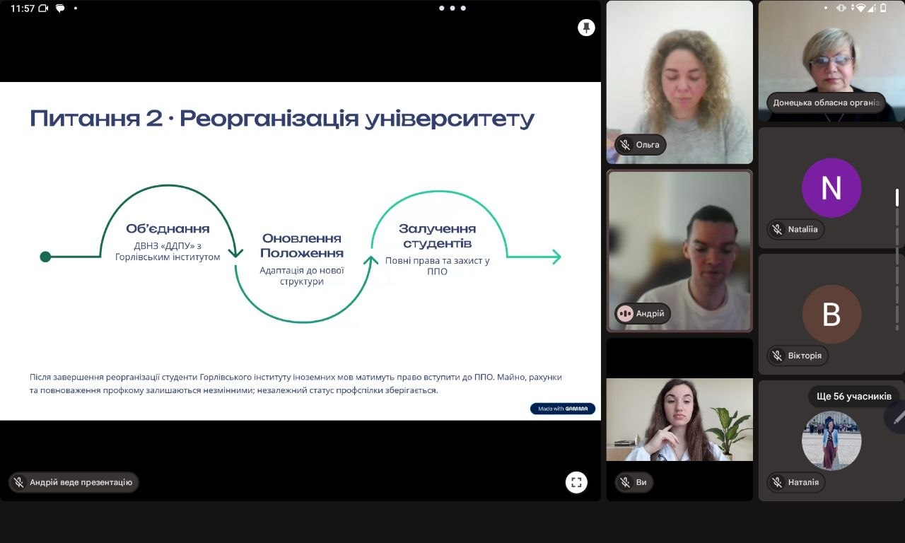 Захід було організовано у зв’язку з приєднанням Горлівського інституту іноземних мов до ДДПУ та необхідністю визначення подальшого статусу і напрямів роботи Первинної профспілкової організації студентів та аспірантів в об’єднаному університеті.