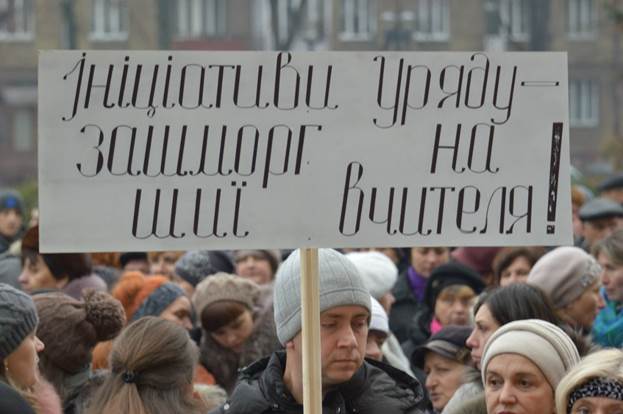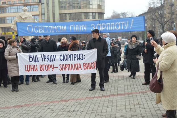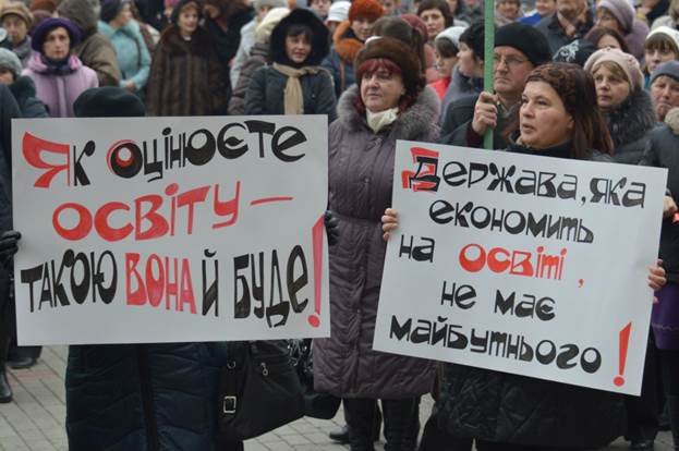 До адміністративної будівлі педагоги прийшли із транспарантами з красномовними написами: «Ініціативи уряду – зашморг на шиї вчителя!», «Освітянам – гідну зарплату!», «Від уряду сюрприз – ціни вгору – зарплата вниз», «Поки депутат зсохне, педагог здохне!» тощо. Вчителі наголосили, що прагнуть донести до влади наслідки економії на вчительських зарплатах, які й так найн6ижчі в Європі.