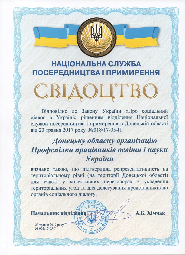 Відповідно до Закону України «Про соціальний діалог в Україні» 24 травня 2017 року на засіданні президії Донецької обласної ради профспілок Донецька обласна організація Профспілки працівників освіти і науки України отримала Свідоцтво про визнання репрезентативності!