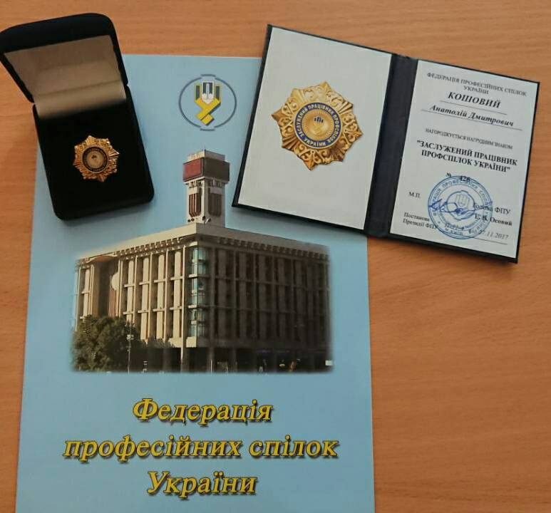 За багаторічну плідну працю, за вагомий особистий внесок в розвиток профспілкового руху та з нагоди ювілею Анатолія Дмитровича нагороджено Почесним знаком «Заслужений Працівник Профспілок України».