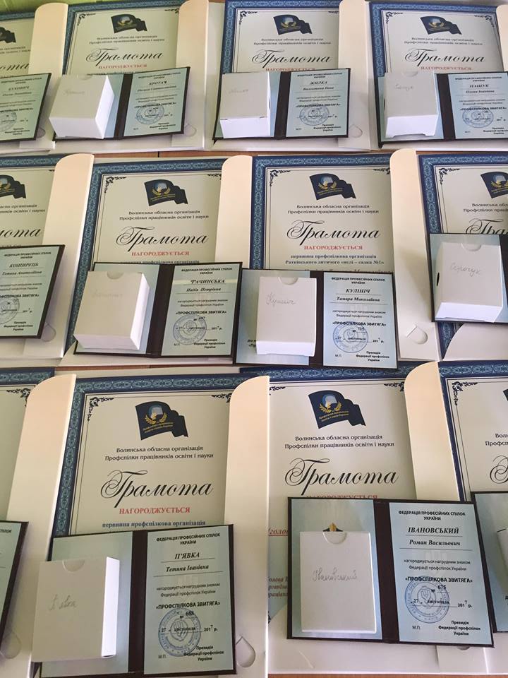 Головам первинок вручили нагрудні знаки Федерації Профспілок України «Профспілкова звитяга», грамотами Волинської обласної організації Профспілки працівників освіти та науки, а також грошові винагороди.