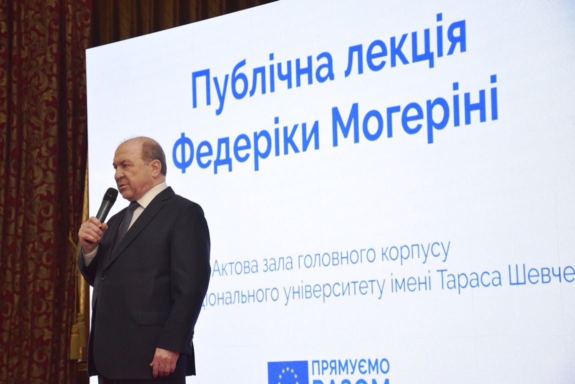 На початку заходу виступив ректор КНУ Леонід Губерський, який відзначив, що для Університету велика честь зустрічати у своїх стінах таку високу гостю, і подякував пані Федеріці за те, що вона знайшла час, аби зустрітися зі студентами та професорсько-викладацьким складом.