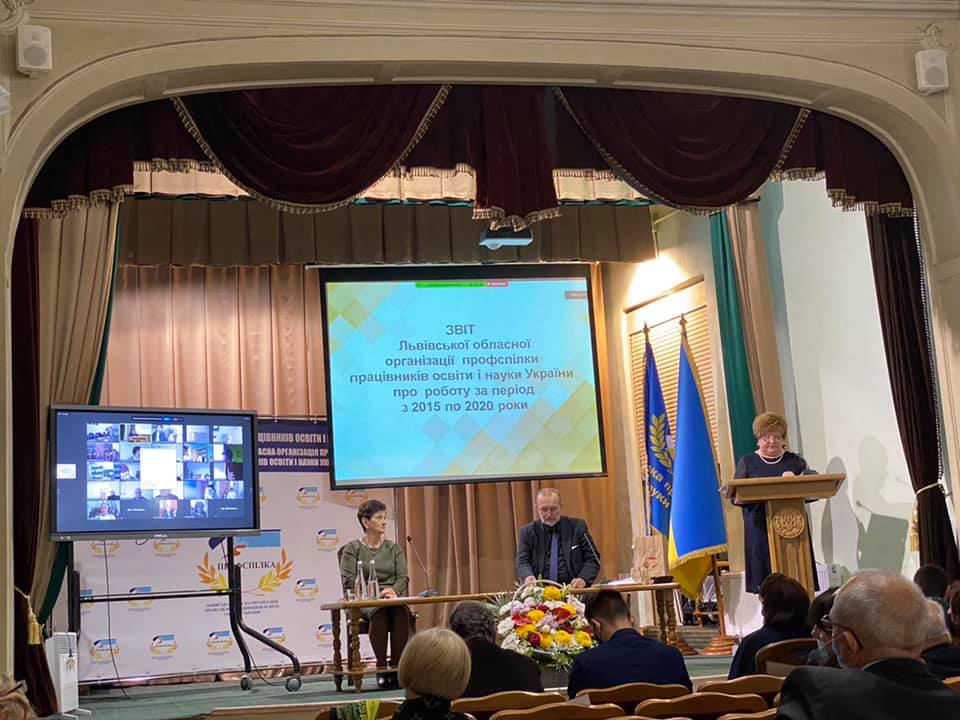 Голова Львівської обласної організації профспілки освіти і науки Марія Яцейко, звітуючи про діяльність за 5 років, розповіла, що сьогодні Львівська обласна організація профспілки освітян обєднує 92 682 спілчанина. А увесь процес виборів у профспілках в умовах карантинних обмежень: «Конференція згідно з постановою була запланована на 13 травня 2020 року, але у зв’язку з карантином впродовж цього періоду і до сьогодні ми проводили конференції в районах, містах, у студентських організаціях. Звісно, було складно. Ми дотримувалися умов карантину і передбачали ту кількість людей на конференціях, яку дозволяли умови карантину, але явка і кворум завжди були, тож конференції відбувались активно. Я справді дуже тішусь, що звітно-виборна кампанія сьогодні вдало завершується».