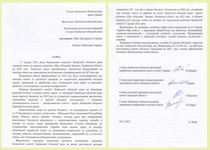 17 грудня 20021 року бюджетною комісією Львівської обласної ради схвалені зміни до проекту рішення «Про обласний бюджет Львівської області на 2022 рік». Зазначені зміни передбачають зменшення фінансування на заклади освіти, що знаходяться в обласному підпорядкуванні, на 267 мільйонів гривень.