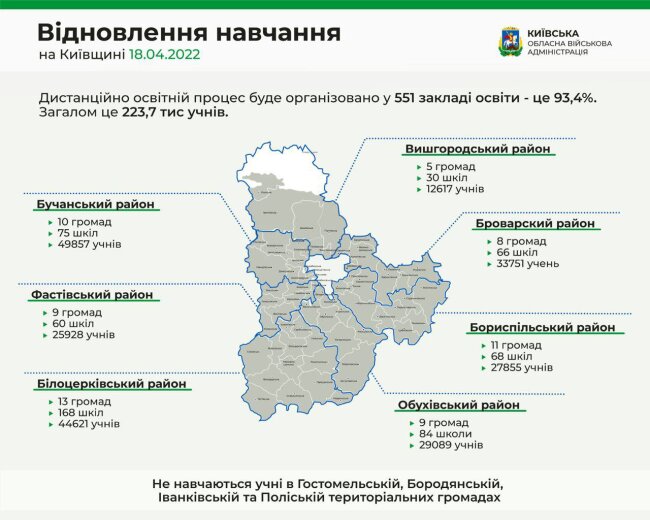Не навчаються учні в Гостомельській, Бородянській, Іванківській та Поліській територіальних громадах.