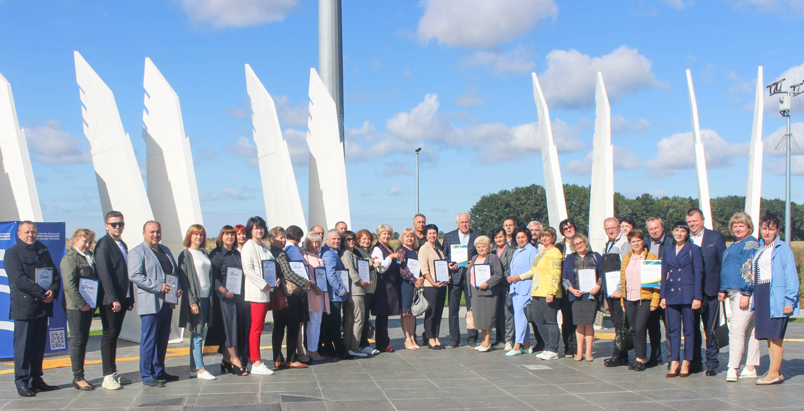 Розпочався захід біля Арт-комплексу «Географічний центр – серце України», куди спілчани з’їхалися з різних куточків Черкащини. Це місце, де під неймовірної краси блакитним небом, величаво майорить державний прапор, реально відчувається ритм «серця», символічні білі крила міст України, – стало знаковим для українців, що й надихнуло присутніх на патріотичний флешмоб.