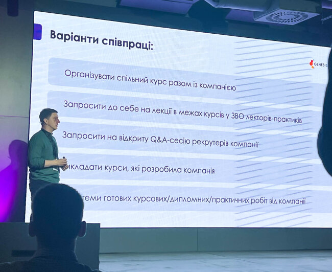 Освіта – одна з пріоритетних сфер Genesis. Окремий департамент Genesis Education створює освітні можливості для українців, також розвиває довгострокову співпрацю з закладами освіти та державою у межах напряму Genesis for Universities. За підтримки Міністерства цифрової трансформації України та Міністерства освіти і науки України Genesis працює над створенням всеукраїнських освітніх курсів-стажувань для студентів усіх ЗВО.