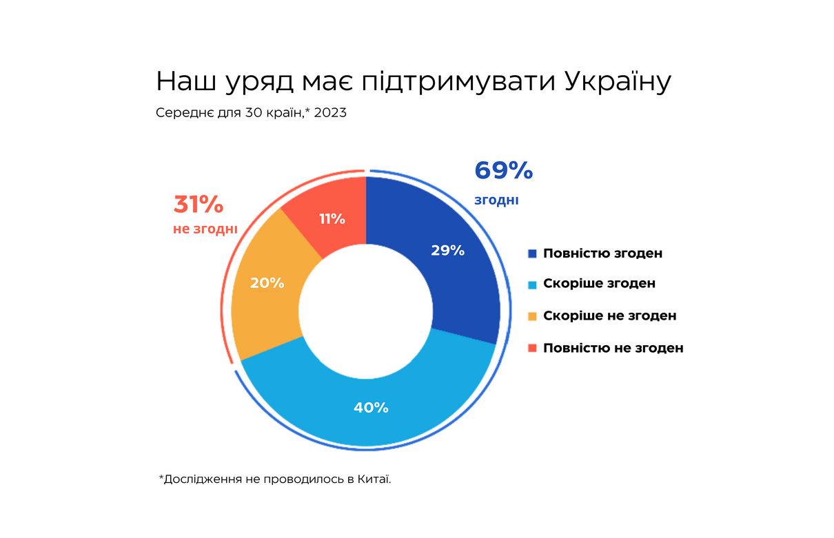 Результати показують, що в середньому 29% опитаних у цих країнах «повністю згодні» з тим, що їхні уряди повинні підтримувати Україну, яка захищається від російської агресії, і ще 40% «скоріше згодні» з цим. Лише 11% «категорично не згодні» і 20% «скоріше не згодні».