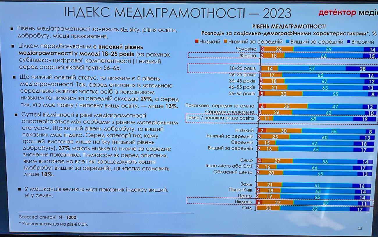 Під час презентації «Детектор Медіа» представила поточний рівень індексу медіаграмотності різних категорій населення. Згідно з результатами дослідження медіаграмотність українців наразі становить: