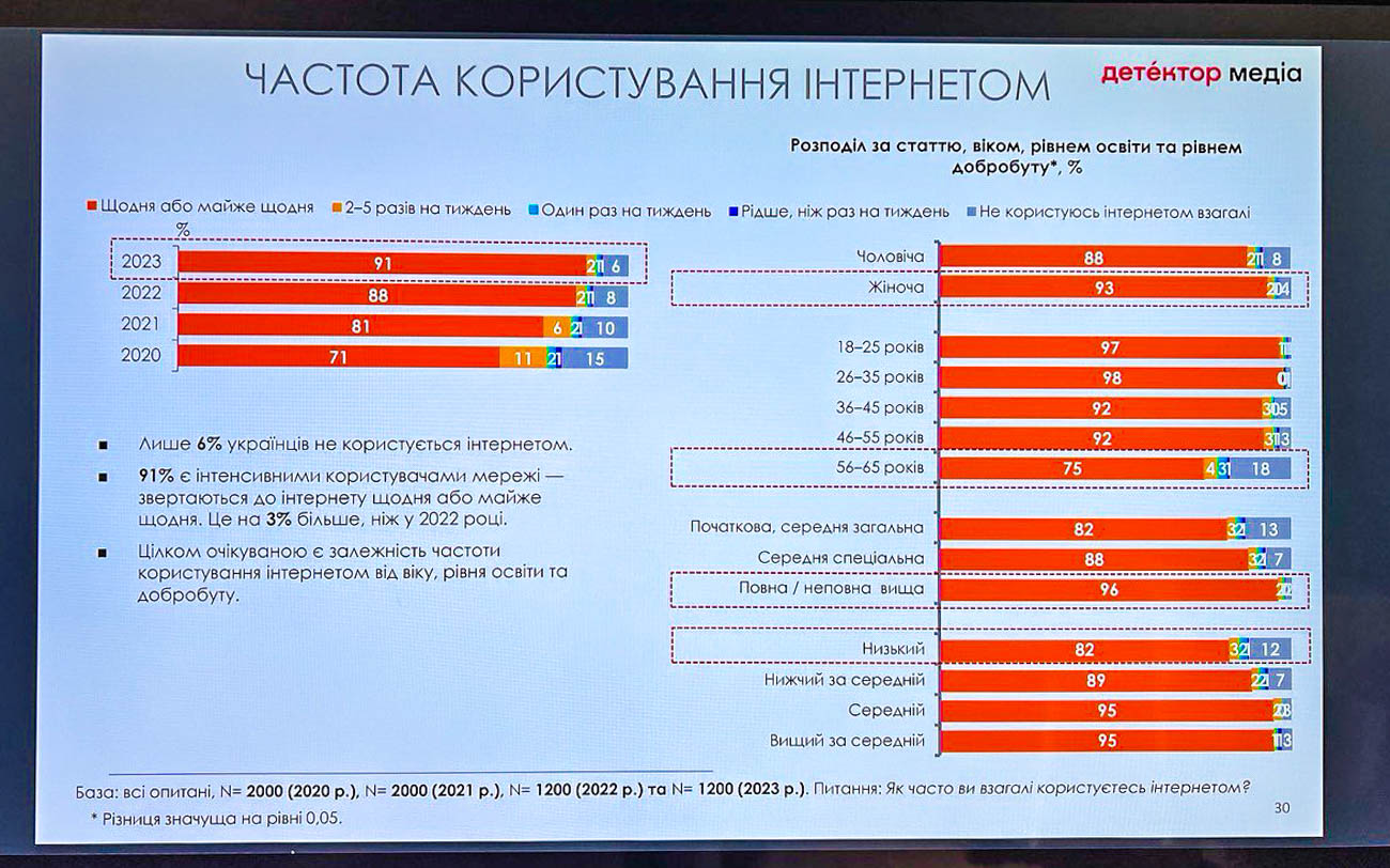 Громадська організація «Детектор медіа» провела кількісне дослідження, аби визначити індекс медіаграмотності українців, тобто рівень вміння свідомо сприймати й критично тлумачити інформацію, а також користуватися розмаїттям медіа.