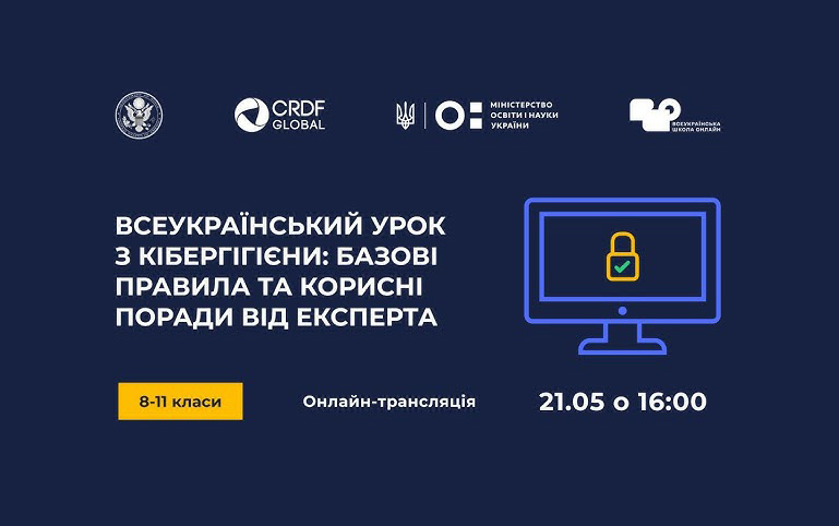 21 травня о 16:00 за ініціативою CRDF Global в Україні та за підтримки Державного департаменту США відбудеться всеукраїнський онлайн-урок із кібергігієни для учнів 8-11 класів.