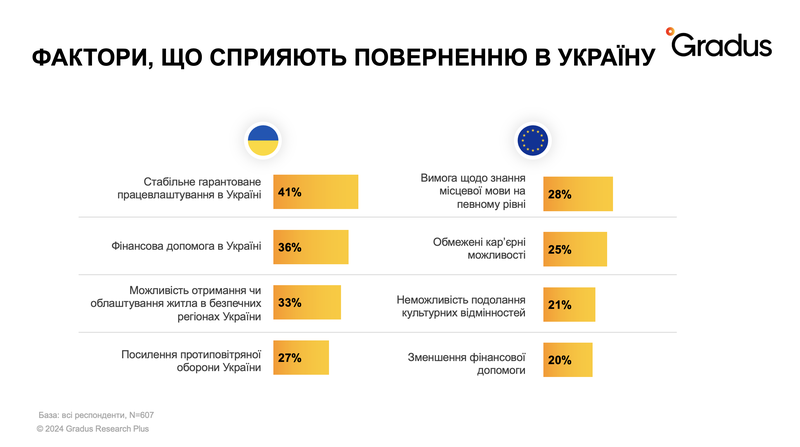 Для 36% важливою є фінансова допомога при поверненні, а для 33% – можливість отримання житла у безпечних регіонах. Ще 27% готові повернутися за умови посилення протиповітряної оборони України.