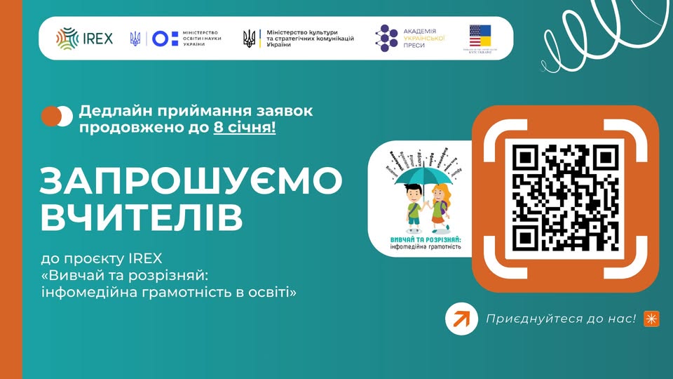 Освітяни, які не встигли зареєструватися для участі у проєкті «Вивчай та розрізняй: інфомедійна грамотність в освіті», можуть зробити це до 8 січня 2025 року!