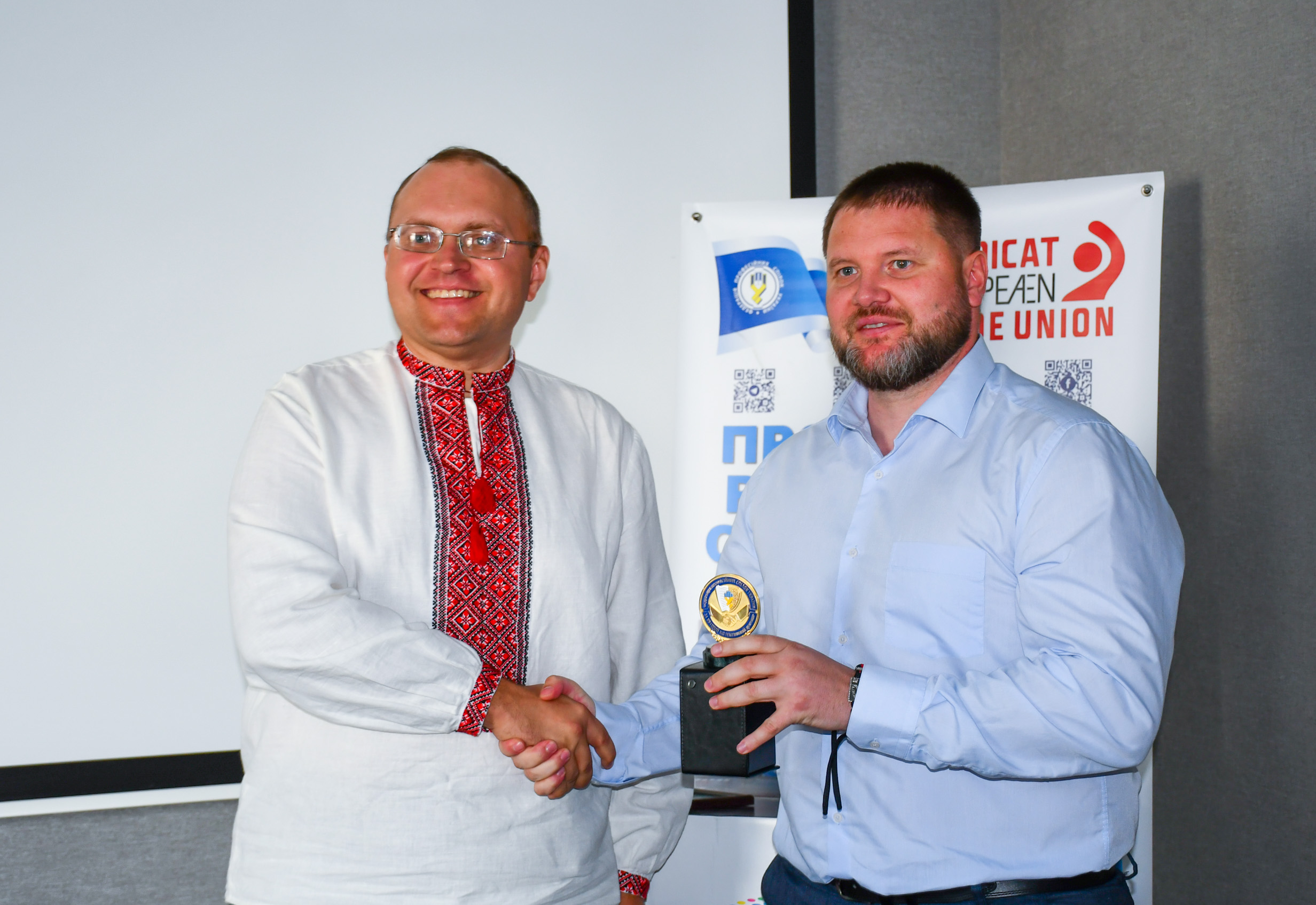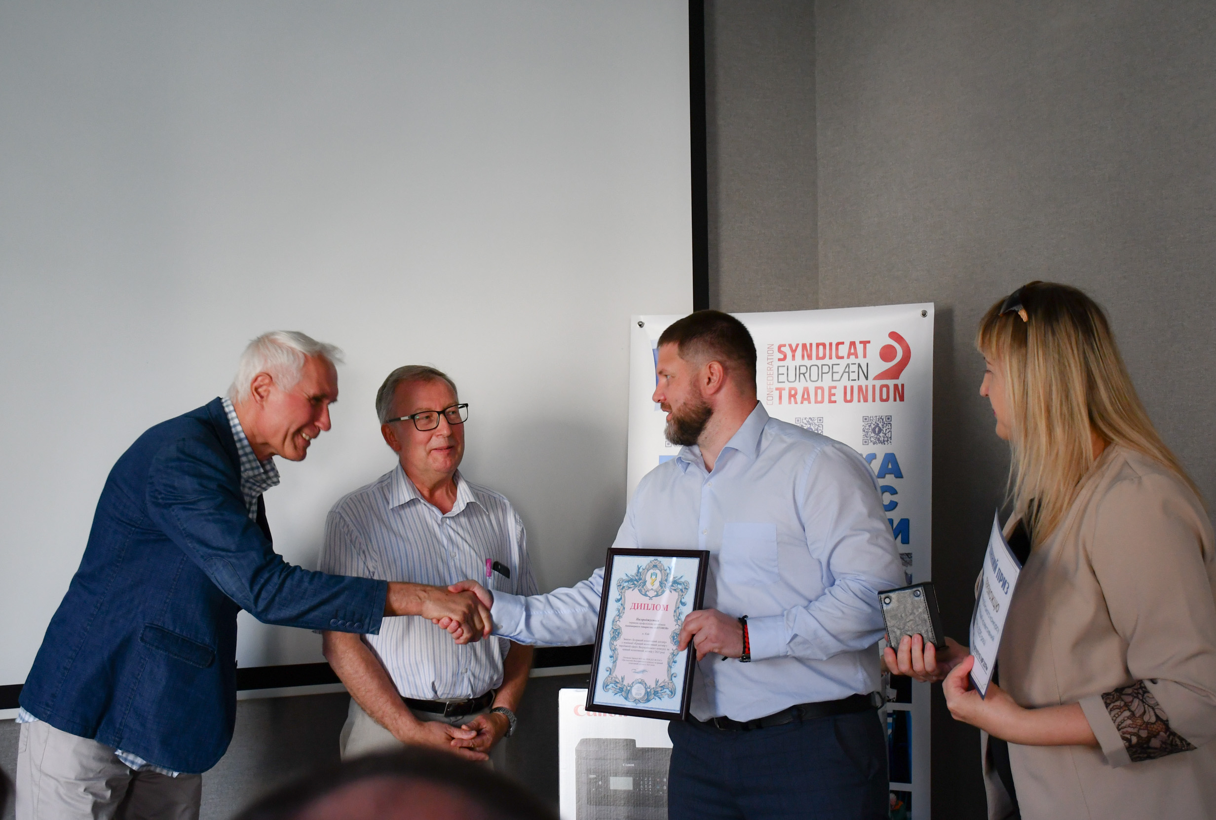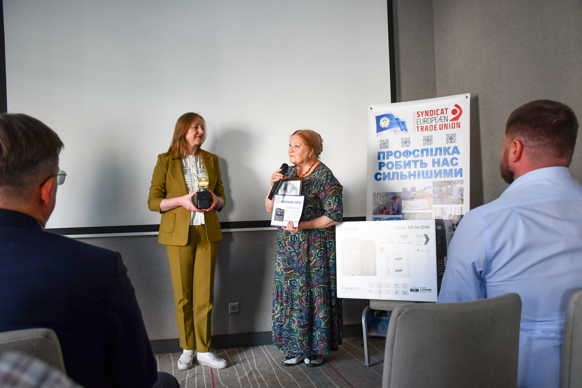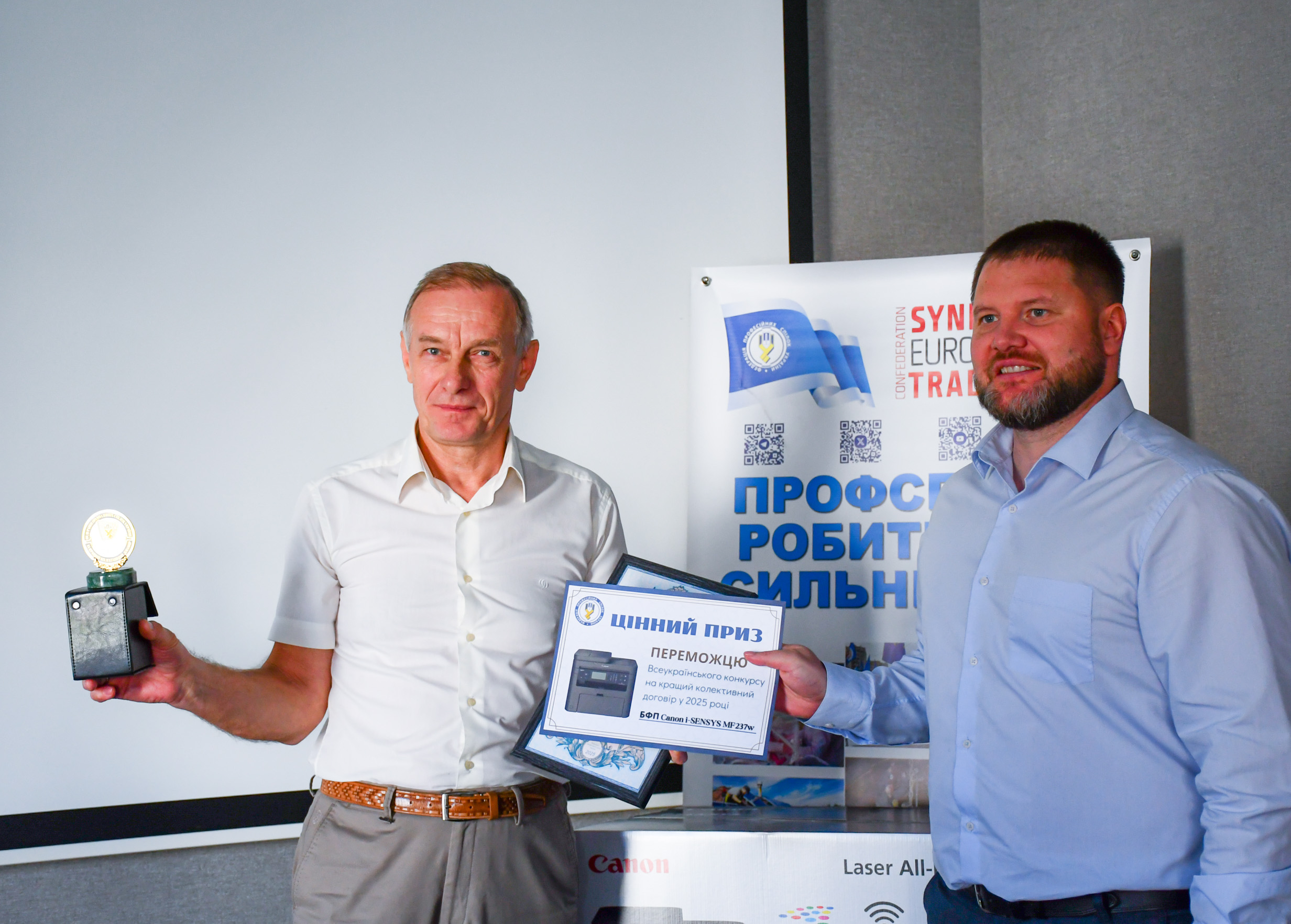 Наприкінці зустрічі відбулася церемонія нагородження переможців Всеукраїнського конкурсу на кращий колективний договір – 2025. Переможці отримали дипломи, відзнаки та цінні призи.