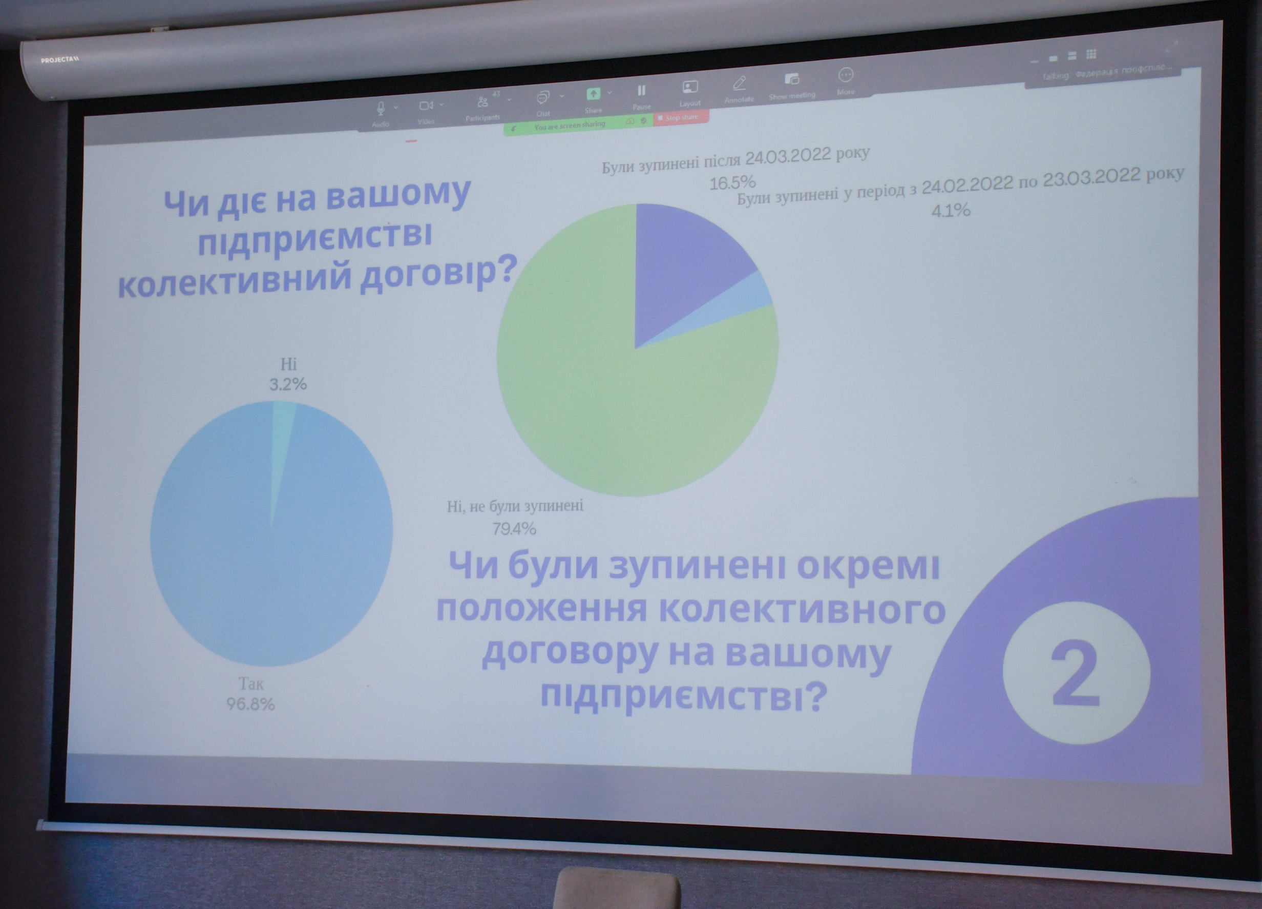 Під час заходу було представлено результати дослідження щодо практики зупинення окремих положень колективних договорів. У дискусії взяли участь Голова ФПУ, народні депутати України, представники Міністерства економіки, Федерації роботодавців України, Офісу Міжнародної організації праці в Україні, всеукраїнських профспілок.