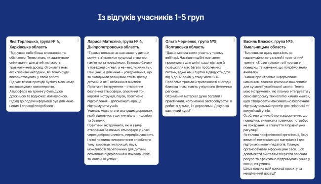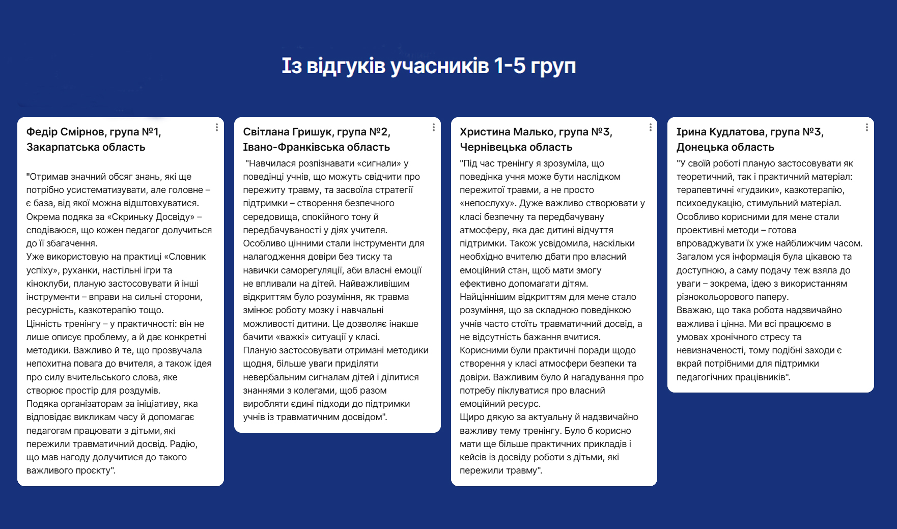 Тренінги проводить психотерапевтка Ольга Денисова. За її словами, учасники(-ці) з усіх п’яти груп виявили неабияку залученість і прагнення опанувати нові знання. «Вчителі відчувають потребу в розумінні власних реакцій на травматичний досвід та в пошуку ефективних способів допомоги дітям та колегам. Вони активні, ділилися історіями зі своєї роботи й прагнуть знайти відповіді на свої далеко непрості питання», – зазначила вона.