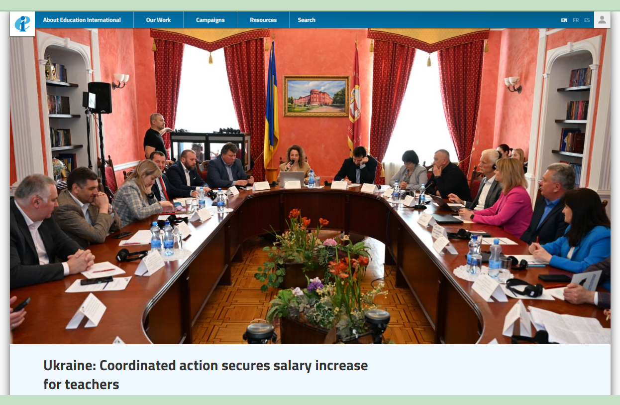 На сайті Інтернаціоналу освіти опубліковано статтю «Україна: спільні дії забезпечують підвищення заробітної плати вчителів» (Ukraine: Coordinated action secures salary increase for teachers).