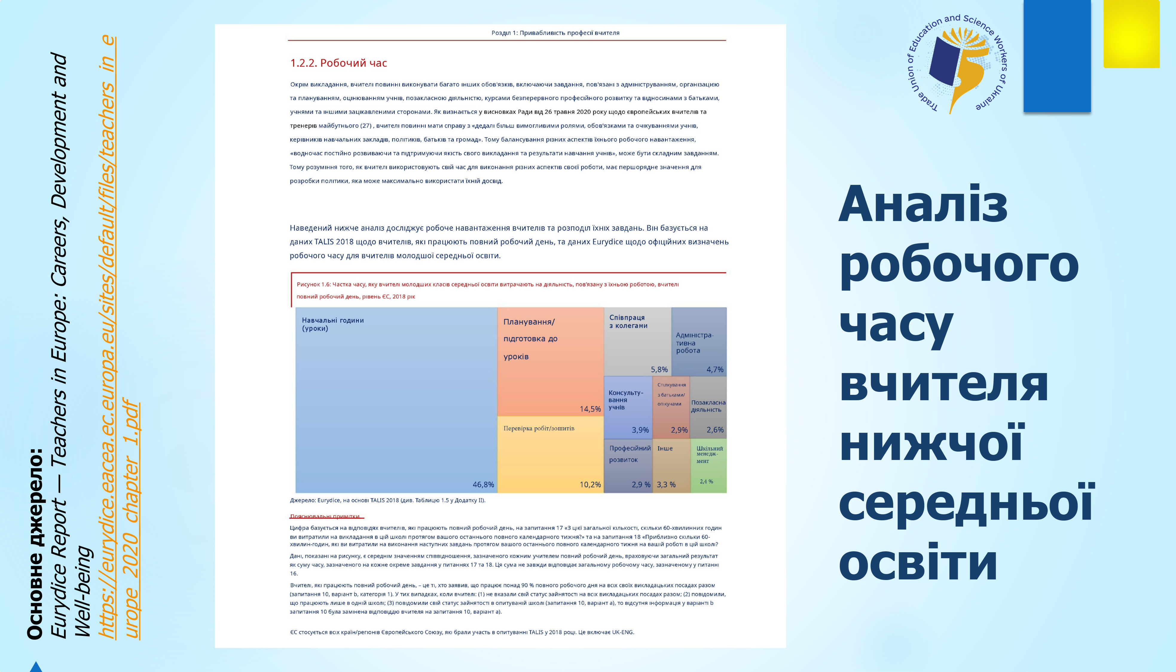 Окремий аналіз представлено для вчителів початкової освіти. У звіті Teachers in Europe (Eurydice) наголошується, що робочий час педагогів охоплює не лише викладання, але й підготовку до уроків, перевірку робіт, взаємодію з батьками, участь у шкільних та позашкільних заходах і професійний розвиток. Саме така багатокомпонентність впливає на фактичне навантаження і потребує збалансованого нормативного підходу.