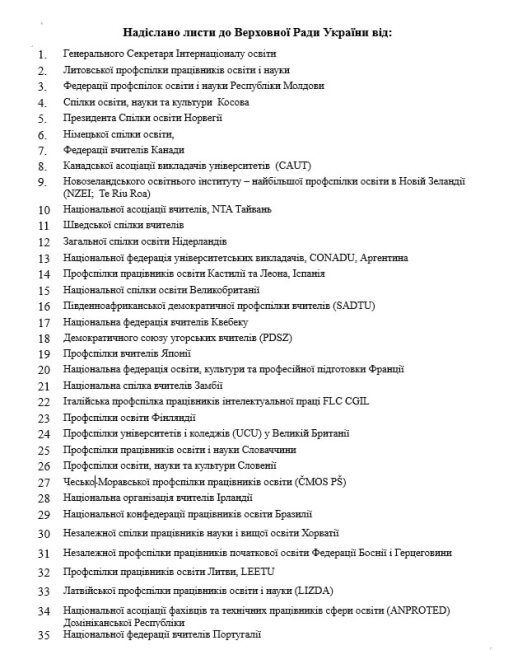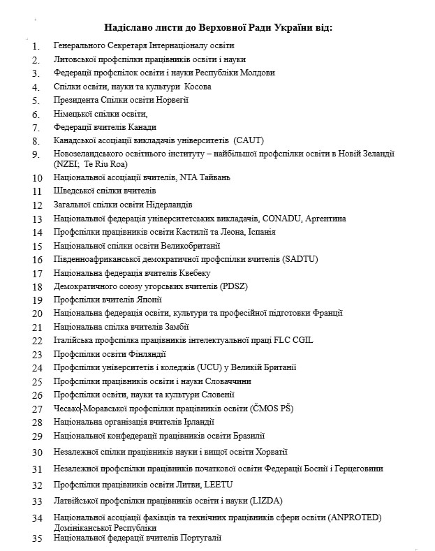 Перелік країн, що надіслали листи на підтримку українських освітян