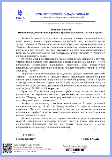 У своєму листі Комітет Верховної Ради України з питань освіти, науки та інновацій також висловлює вдячність Профспілці за активну та відповідальну позицію у відстоюванні трудових прав педагогів і підкреслює важливість подальшої конструктивної співпраці.