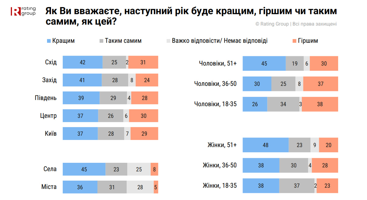 Водночас молодь віком 18-35 років залишається найбільш оптимістичною: серед неї на покращення сподівається до 38%, тоді як серед людей старшого віку – менш як чверть.