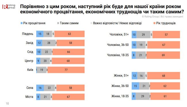 Більшість респондентів (64%) вважають, що 2026 рік буде складним в економічному плані, і лише 11% очікують на зростання та добробут. Для порівняння: у середньому у світі частка таких песимістичних оцінок становить 40%, у Західній Європі – 47%.