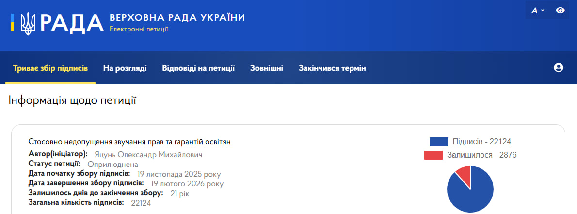 Станом на сьогодні петицію підтримали понад 22 тисячі громадян. Водночас для її обов’язкового розгляду парламентом необхідно зібрати 25 тисяч підписів. Тобто бракує лише приблизно 2 800 голосів, а часу залишається зовсім небагато.