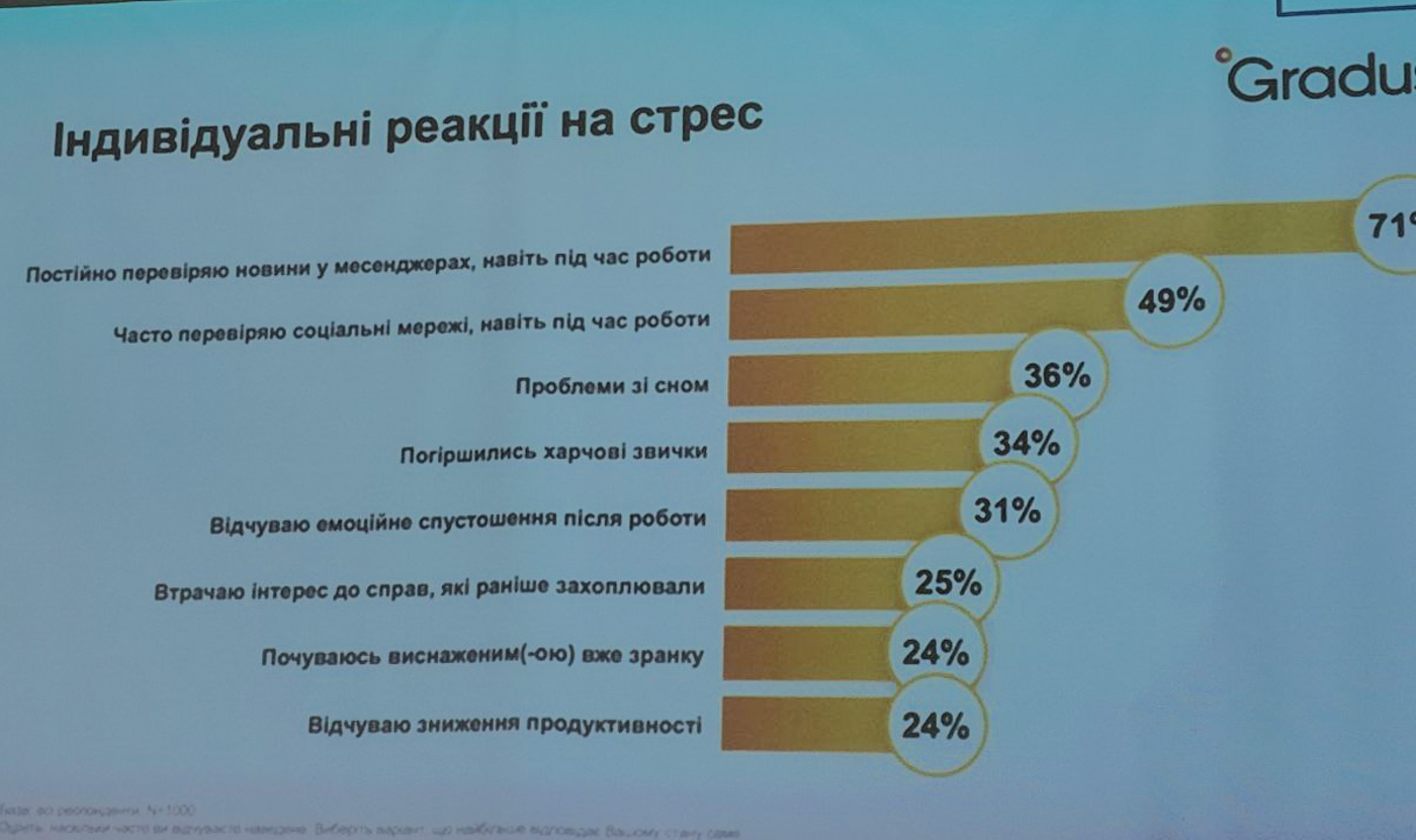 Експерти наголосили, що на робочому місці є потреба у психосоціальній підтримці, адже 63% людей віком 30-50 років мають найнижчу фізичну та психічну стійкість, 72% жінок відчувають більше негативних емоцій, ніж чоловіки, а 56% працюючих стикаються з втомою, проблемами зі сном та харчуванням.