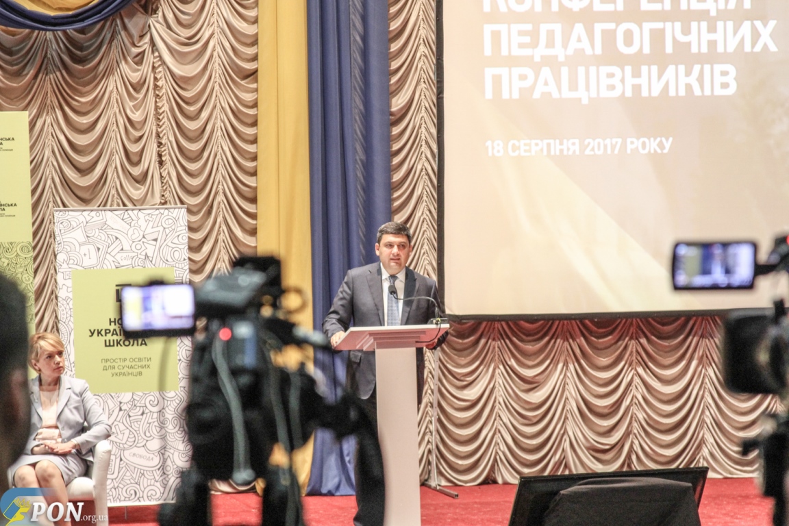 Прем’єр-міністра Володимир Гройсман розпочав свій виступ зі слів вдячності кожному вчителю, який працює в таких непростих умовах, вкладаючи у дітей не лише свої знання, але й серце і душу. Він наголосив, що наступний – 2018 рік стане роком розвитку якісної освіти в Україні – за рахунок створення опорних шкіл, переоснащення навчальних закладів і забезпечення їх матеріальних потреб, перегляду освітніх програм та продовження політики збільшення заробітних плат українським вчителям.