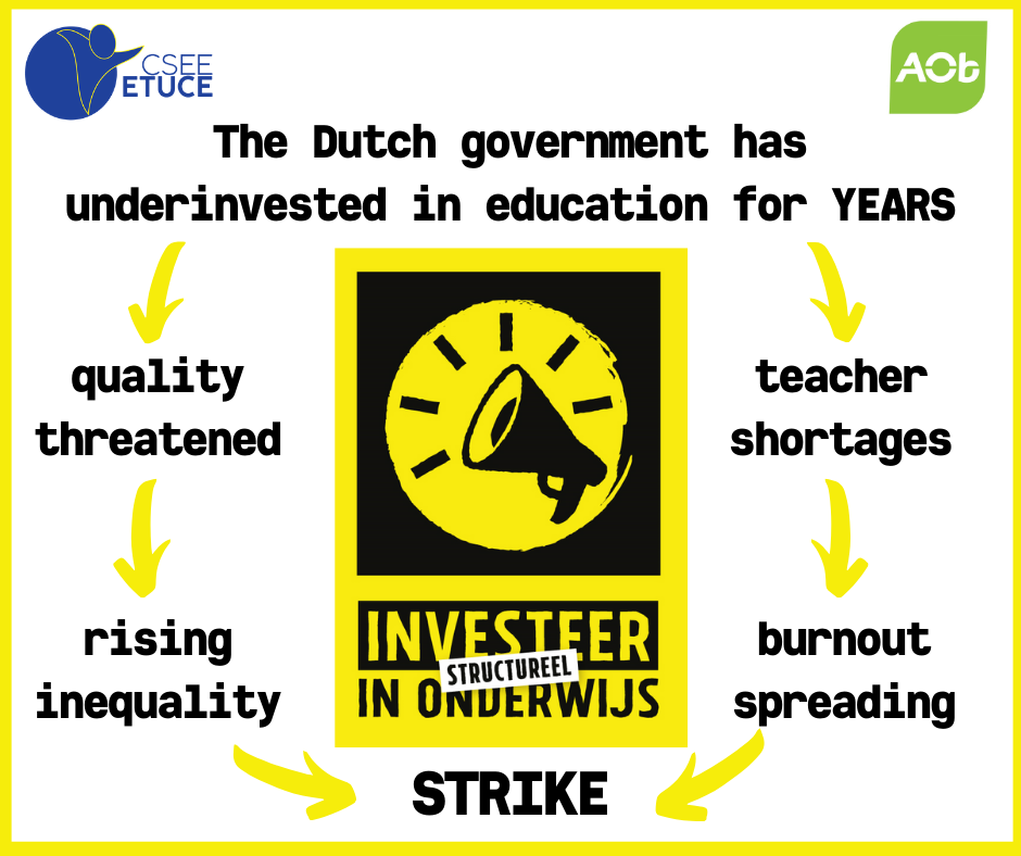 У листопаді 2019 року Профспілка освіти Нідерландів (Aob), яка є членською організацією ЄКПО оголосила страйк. Дійсно, уряд зробив крок, запропонувавши 460 мільйонів євро на освіту. Однак, працівники освіти та освітянські профспілки були дуже розчаровані, дізнавшись, що це лише разова виплата.