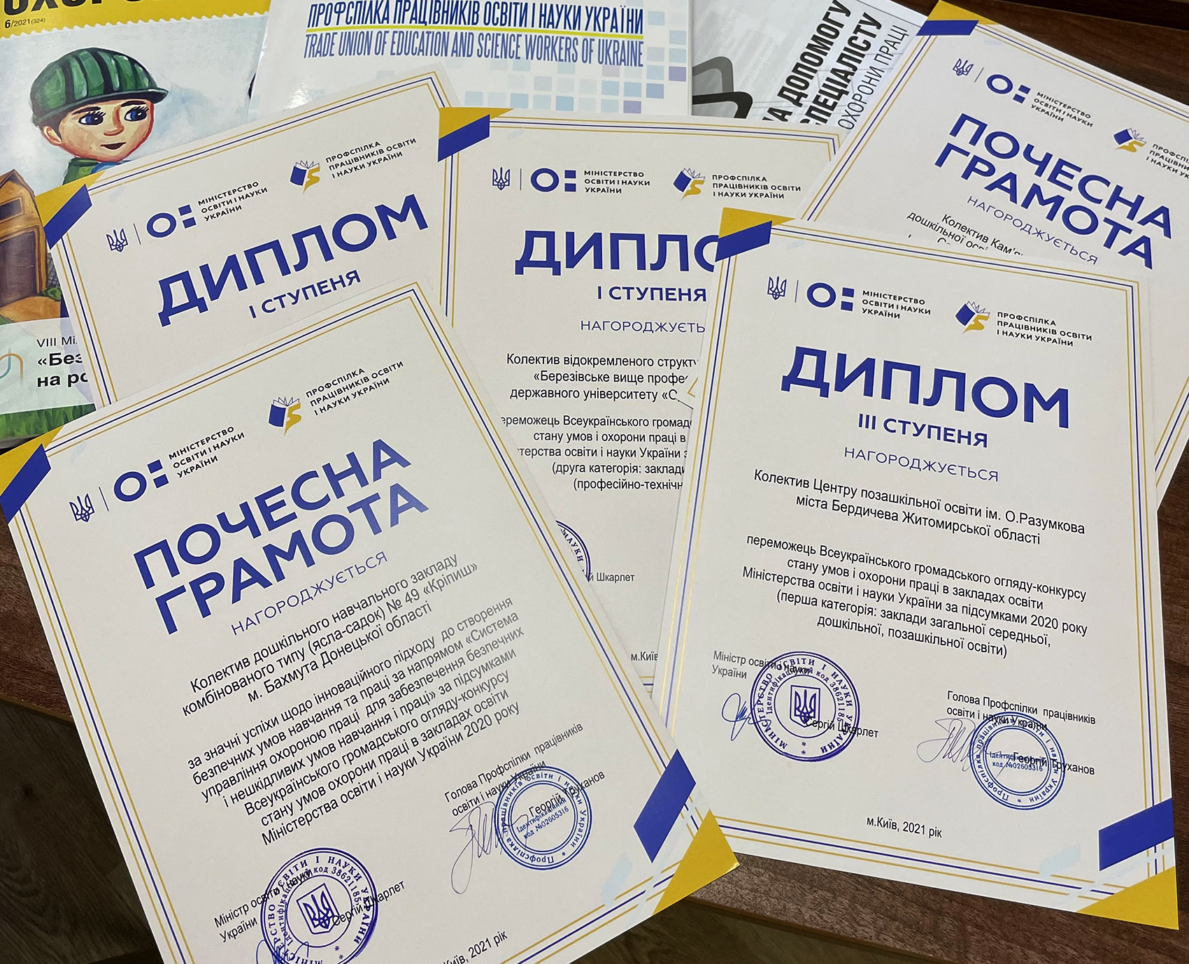 Також визначено нагородити Почесною грамотою Міністерства освіти і науки України та ЦК Профспілки працівників освіти і науки України колективи закладів освіти, які досягли значних успіхів щодо інноваційного підходу до створення безпечних умов навчання та праці за напрямами: