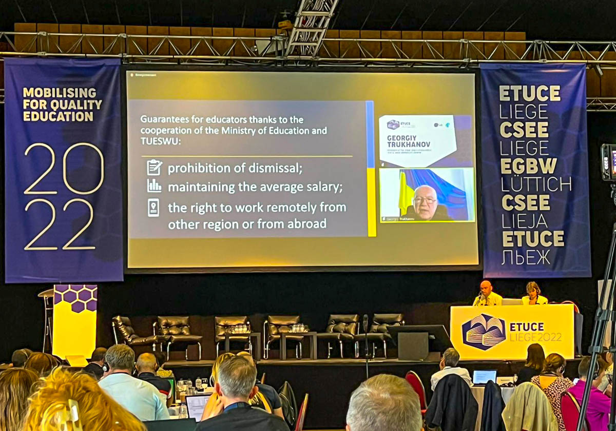Під час представлення та обговорення резолюції щодо встановлення миру в Україні, перед делегатами конференції із Києва в онлайн режимі виступив Голова Профспілки працівників освіти і науки України Георгій Труханов.